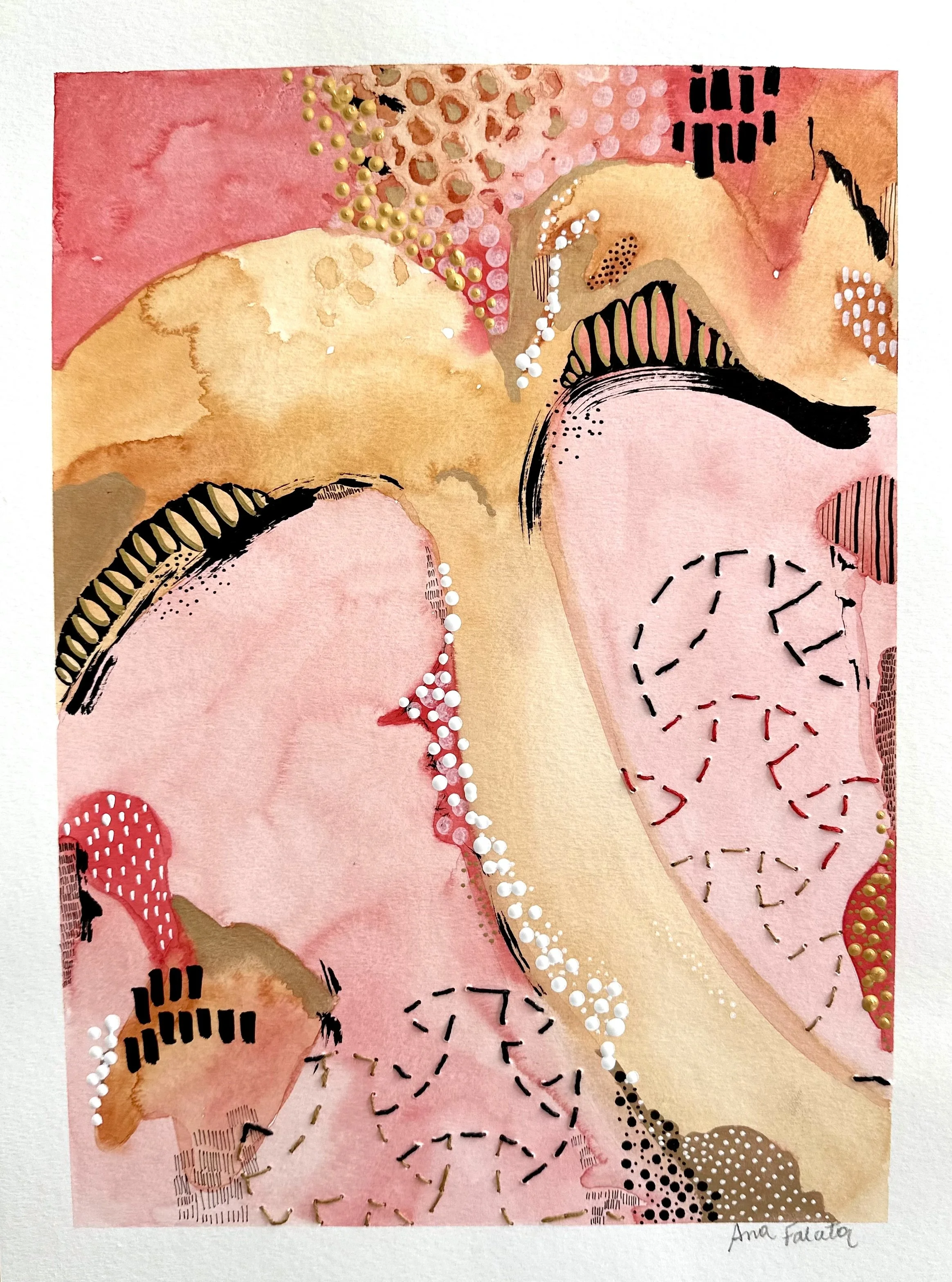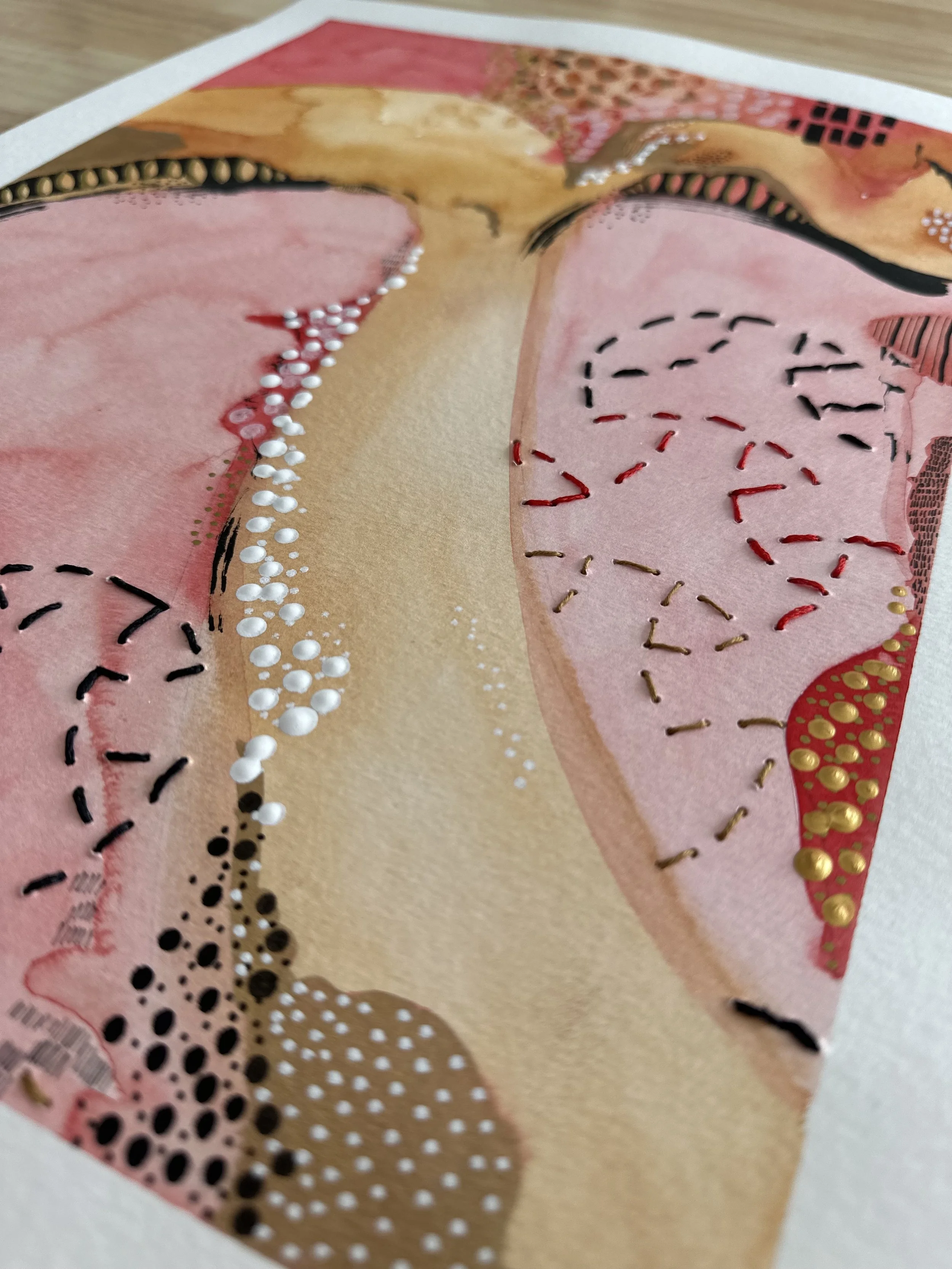 Materials: Watercolour , ink, linen thread, and embroidery on paper
